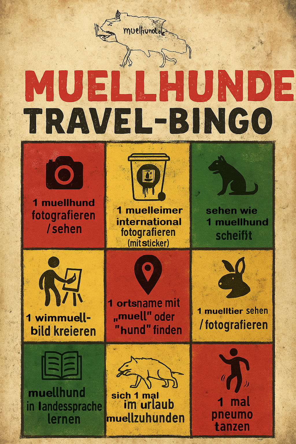 muellhun.de praesentiert: das spiel zum spielen beim reisen - das muellhu.de travel bingo! spiele, sende dein bingo an uns und gewinne was echt muelliges!